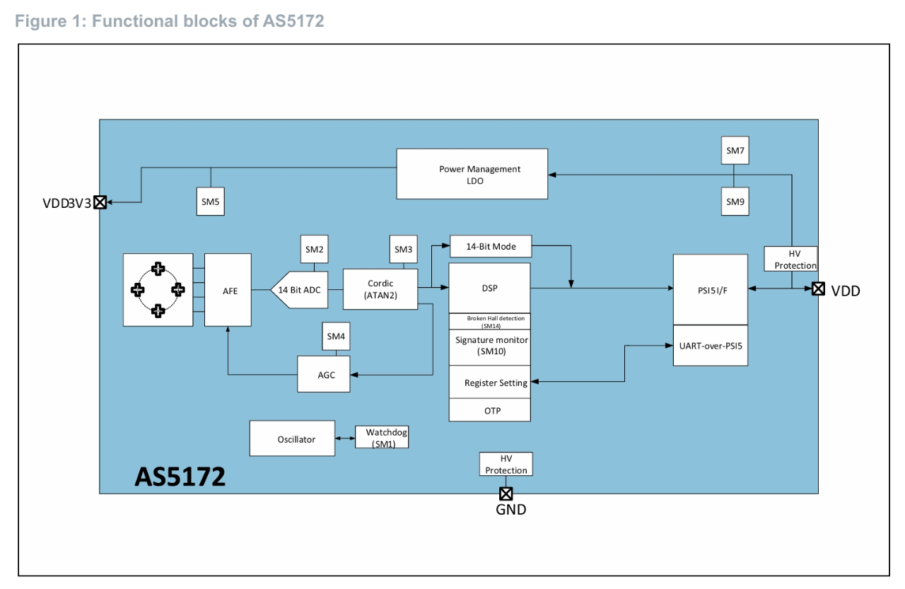 The AS5172B is a magnetic position sensor with a high-resolution 12-bit PSI5 output, compliant with PSI5 specification versions 1.3 and 2.1.