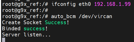 First, execute ifconfig eth0 192.168.1.99 in the serial port to set the IP address for communication with the X9HP. Then directly run the auto_bcm /dev/vircan command and wait for the X9HP to connect:
