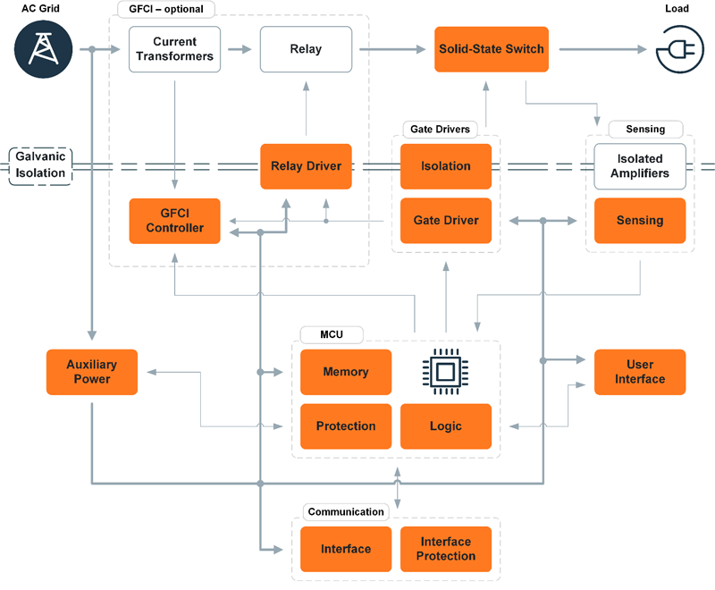 用半导体开关替代机械触点可彻底消除电弧,因为电流切断是在物理触点分离前通过电子方式完成的。半导体开关能在微秒级时间内关断,大幅降低短路峰值电流。此外,与机械部件不同,半导体开关专为高频操作设计,且不会随时间推移而老化。这类采用半导体开关的器件被称为固态断路器 (SSCB),通常用于保护直流电路与交流电路。