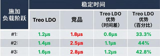 如上两幅图表展示了T30LxPSR165 Treo LDO的实际“尖峰负载” 测试, 测试中施加了三个连续的负载波形, 分别标记为 #1、 #2 和 #3。 请注意, #1与 #2 之间的时间间隔接近 1 微秒(μs) 。 下方的图表以蓝色显示了 Treo LDO对应的瞬态响应包络线, 并以红色显示了性能次佳的竞品 LDO 的响应曲线。