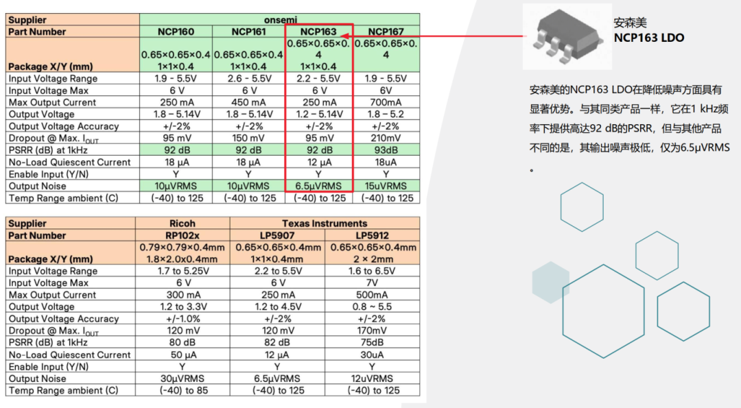 在器件数据手册中, 噪声性能主要通过两项关键指标进行评估: 第一项指标记录器件在10Hz至100kHz频率范围内的总噪声电压。 此项数值越低,性能越好。 针对VAA电源轨(模拟电源), 应选择低噪声输出的LDO, 理想情况下其均方根值(RMS) 应低于20μV。 此参数在数据手册中通常标注为"VRMS"。电源抑制比(PSRR)