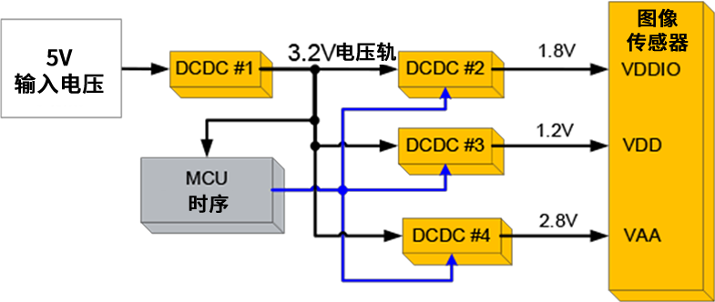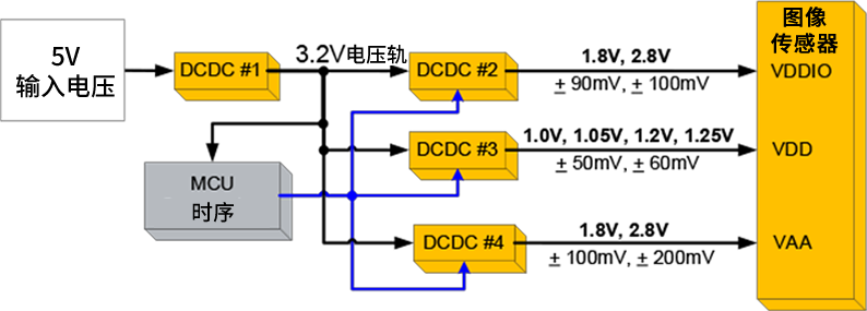 图像传感器应用中典型的电源树结构, 采用四个稳压器为三路电源供电。