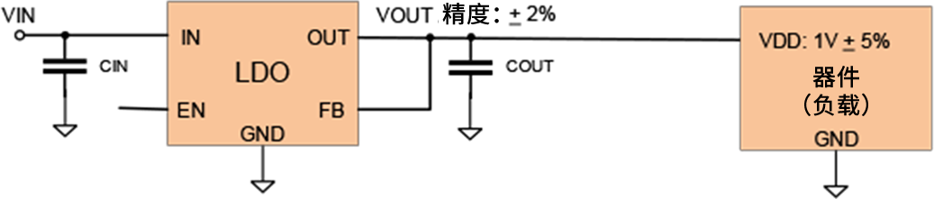 假设某器件由 1V 的 VDD 电源轨供电, 其允许的电压容差为享5%(即享50 mV)。 根据器件规格, 其VOUT精度为享2%。