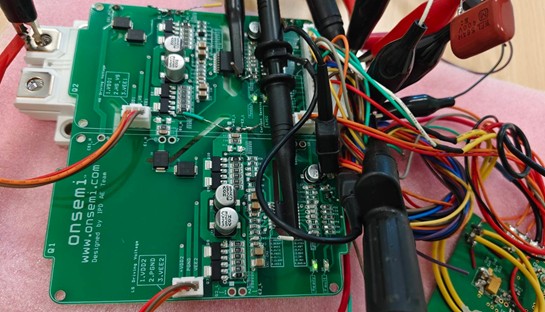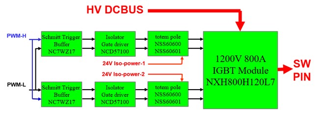 基於大功率應用非常在乎最小Dead time以提高有效週期寛度,故會建議採用高抗噪能力、低傳遞延遲、帶IGBT飽和偵測功能同時符合5KV電氣隔離(符合 UL1577要求)的數位隔離Gate driver NCD57100,另因數位隔離驅動器PWN信號腳位通常是接收5V邏輯準位,所以建議在Gate driver之前增加二路史密特觸發緩衝器,以確保能提供穩定的邏輯準位PWM信號同時達到互鎖功能以避免同時開啟造成上下橋直通的風險,再者是,由於可承載功率大零件材積也大,其對應的Ciss與Qg值是一盤離散元件的數十倍,故需要在Gate diver後端增加圖騰柱驅動線路才能順利且快速的開啟或關閉模組內各別的IGBT。