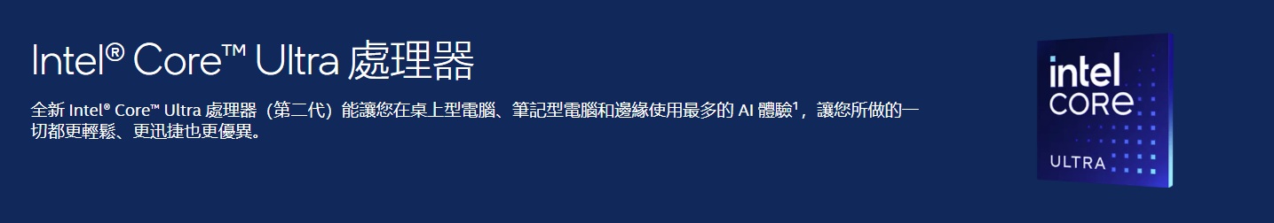 Intel® Core™ Ultra 處理器(系列 2)專為助您成為 AI 領導者而打造。從強化的生產力到更高的安全性和速度,Intel 的 AI 是新一代處理器效能的關鍵。