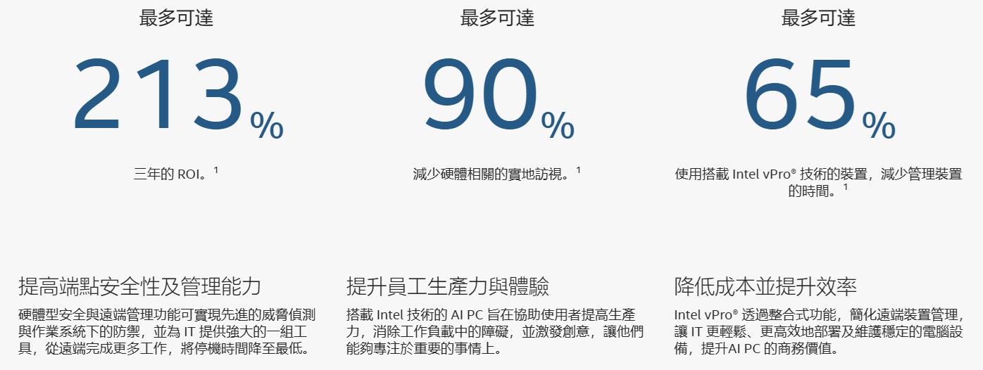 **Intel vPro® 是專為現今企業所面臨的挑戰而打造,提供硬體層級的管理與安全功能,協助 IT 確保分散式裝置安全無虞、維持最新狀態,並運作順暢。